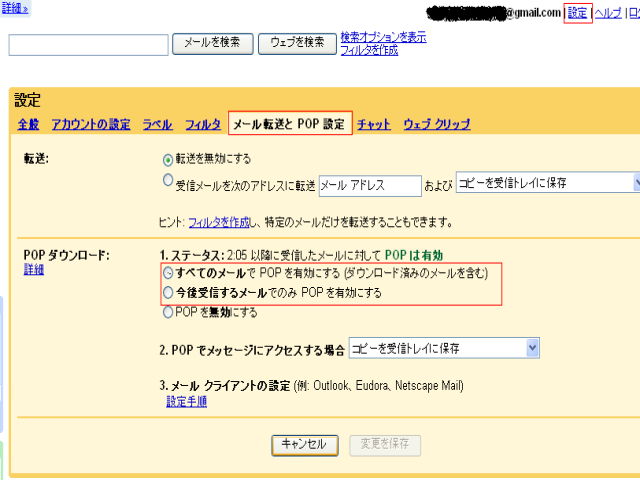 1.Gmailにログインし、設定をクリックし、メール転送と POP 設定を開く。