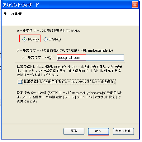 受信サーバはPOPを選択し、