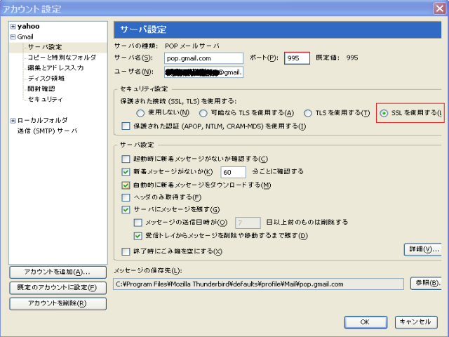 例として、「thunderbird」、「________@gmail」としています。