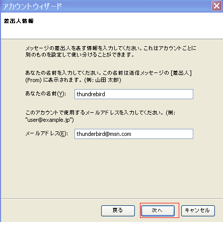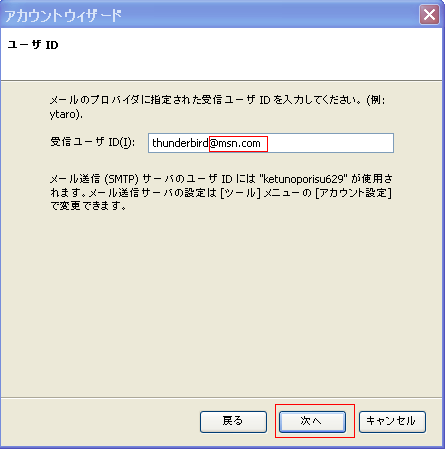 例として「thunderbird」「thunderbird@msn.com」としています。
